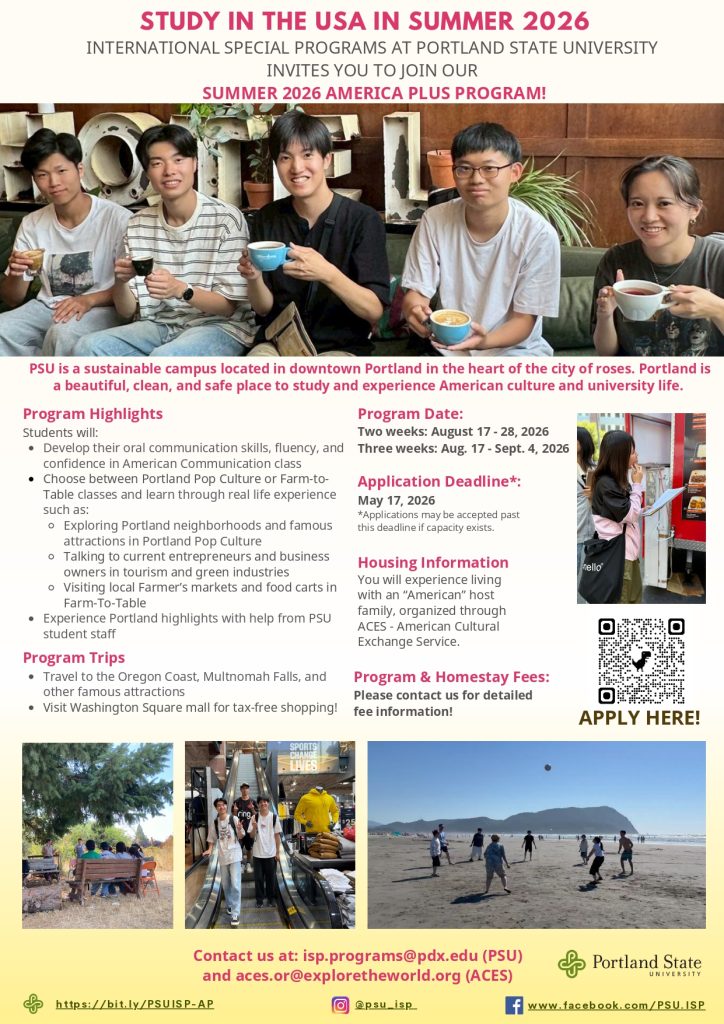 夏休みに開催される「ポートランド州立大学語学研修」の参加者を募集します。