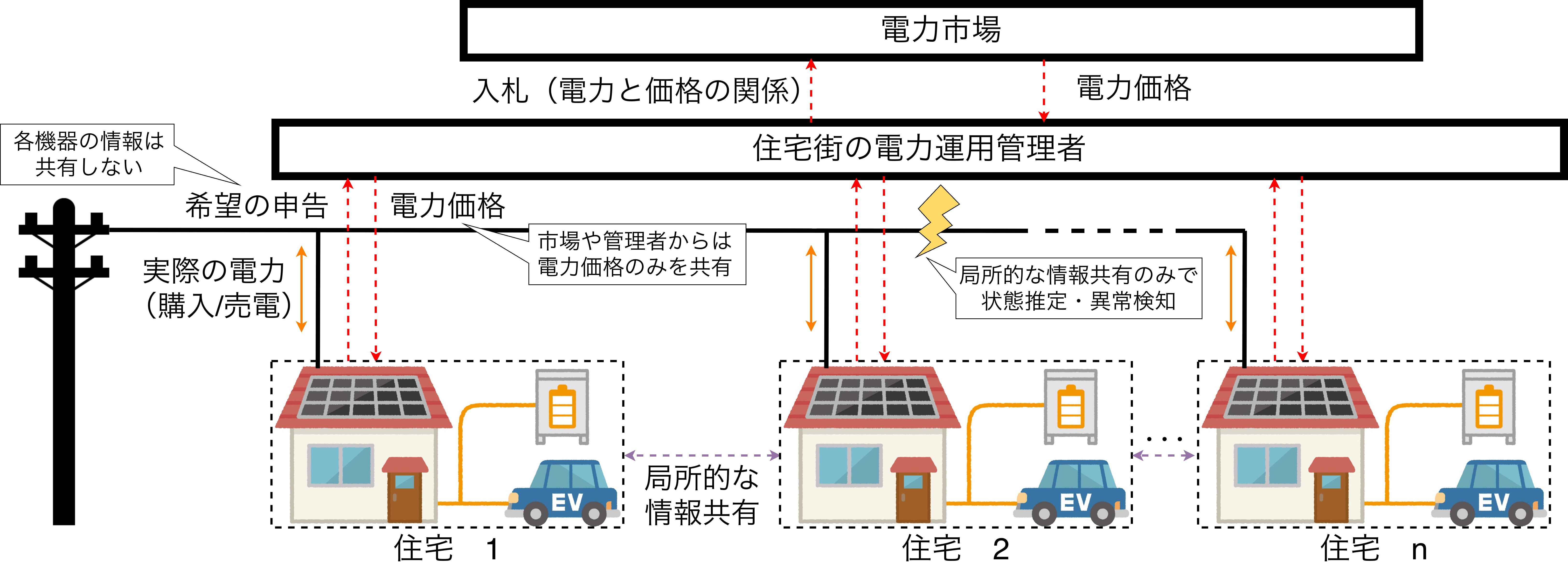 脱炭素社会の実現のために,太陽光発電や電気自動車などの機器が利用されています.しかし,多様な機器が電線に接続されることで,電圧などの状態も複雑に変化します.さらに,多様な機器の管理には難しさが存在します.特に管理のために,私たちが持つ情報の全てを外部へ共有することは,プライバシーの点で問題があります.このテーマでは,限られた情報の共有のみで,全体を適切な状態に維持する制御システムや電線の状態推定技術を開発します.