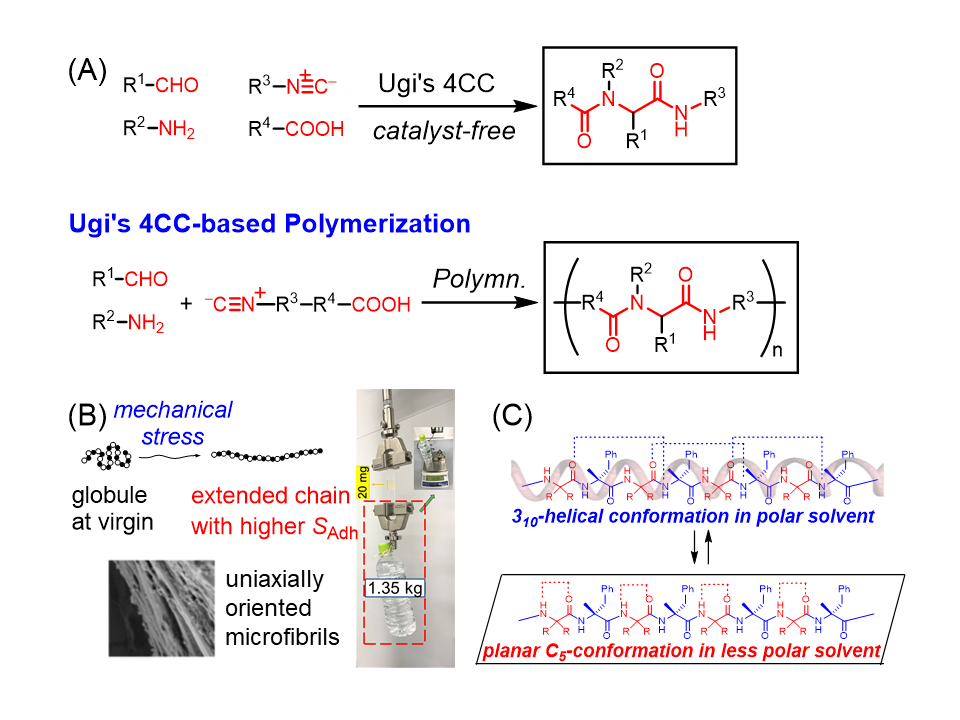 We observed that applying shear stress to peptides bearing bulky substituents induces strong adhesion (B). We found that stress induces the peptide to transform into an extended chain state; the relaxation of this extended chain structure is kinetically suppressed by the bulky substituents; and microfibres form along the stress direction. Their entanglement (physical cross-linking) results in strong adhesion between interfaces. Further research into rationally controlling peptide higher-order structures via external stimuli has also been pursued. By alternately arranging α-methylphenylalanine and α,α-dialkylamino acids, we have successfully developed a peptide-type folder that switches between a 310 helical structure and a planar C5 structure in response to solvent polarity changes (C).
