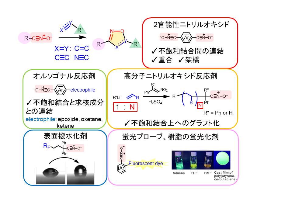 We are developing various nitrile N-oxide-based ligation tools that enable the catalyst-free ligation between high-molecular-weight building blocks. Nitrile N-oxides are highly reactive 1,3-dipoles that undergo 1,3-dipolar cycloaddition reactions with various unsaturated bonds without catalysis. However, their high reactivity renders them chemically unstable, making isolation difficult. Conversely, introducing bulky substituents around the nitrile N-oxide thermodynamically suppresses decomposition reactions, enabling stable isolation. We have developed stable nitrile N-oxide reagents including: i) homoditopic nitrile N-oxides, ii) orthogonal agents, iii) polymer nitrile N-oxide agents, iv) water-repellent agent, and v) fluorescent probes. We report on the catalysis-free reactions of organic macromolecules and the functionality of synthetic molecules using these reagents (see figure below).