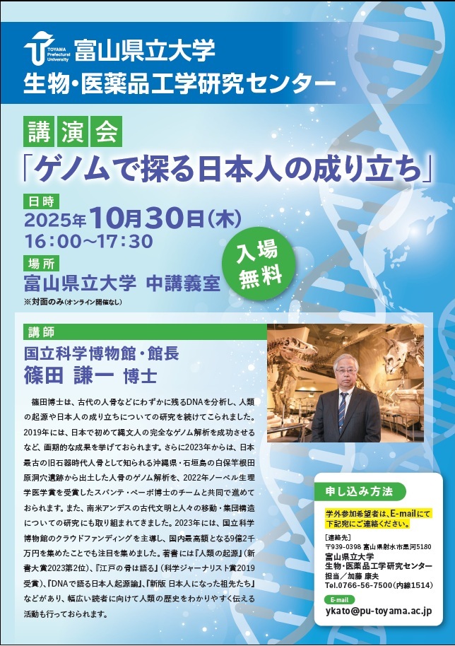 令和2年1月24日(金)17時~18時30分 等 泰道 博士(サイアス株式会社 代表取締役)をお招きし、富山県立大学 生物・医薬品工学研究センター1階