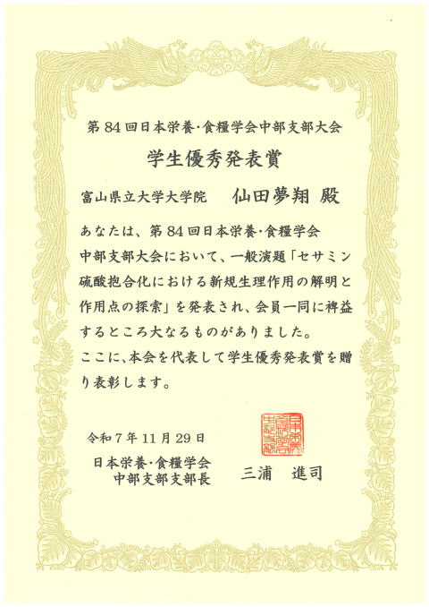 安田研究室・仙田夢翔さん(M2)が、第84回日本栄養・食糧学会中部支部大会で『学生優秀発表賞』を受賞しました。