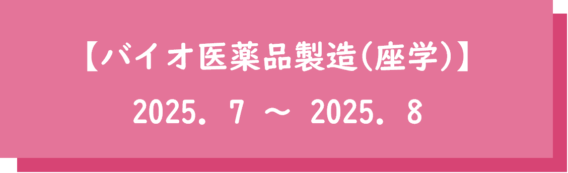 | 7月10日(木) | 9:15 - 12:00 | 研修室1 | 細胞培養・バイオ医薬の製造(概論) 抗体医薬の製造(遺伝子組換え・生産細胞) |