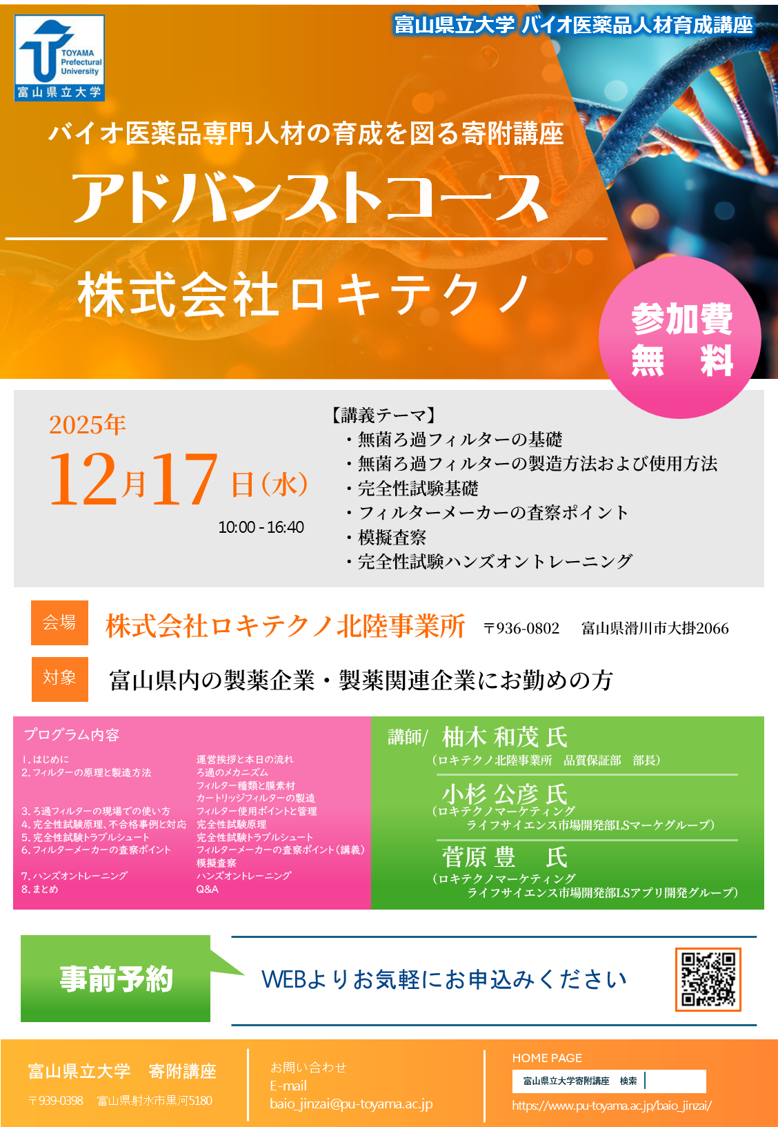 | 対 象: | 県内の製薬企業・製薬関連企業にお勤めの方 ※本コースは、商社や㈱ロキテクノの競合となる企業様につきましては、 お申込をいただいた場合もお断りさせていただいております。ご了承ください。 |