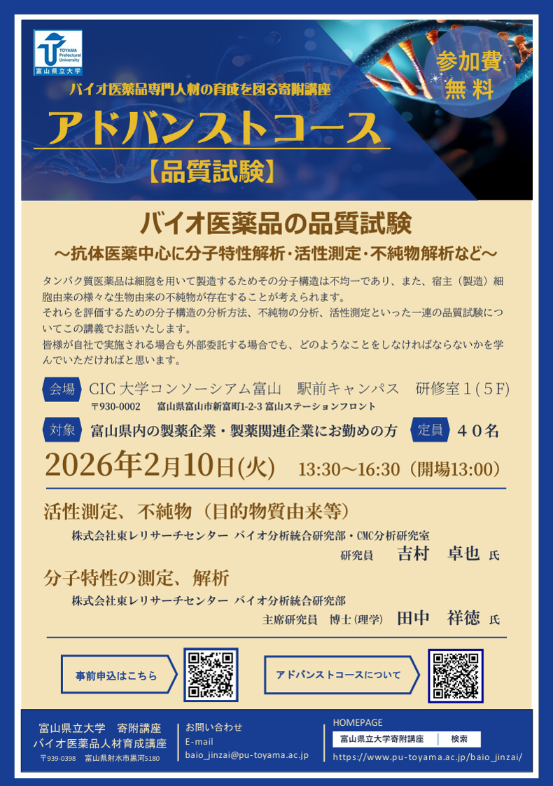 | 【講師】 | 吉村 卓也 氏 | 株式会社東レリサーチセンター バイオ分析統合研究部・CMC分析研究室 研究員 | |