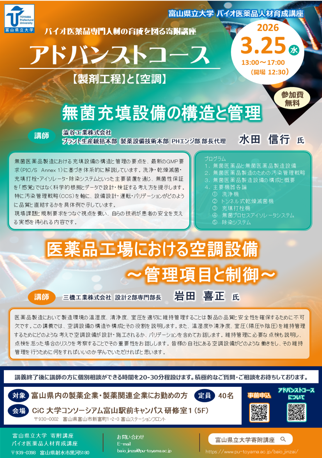 | プログラム | 1.無菌医薬品と無菌医薬品製造設備 2.無菌医薬品製造のための汚染管理戦略 3.無菌医薬品製造設備の構成と概要 4.主要機器各論 ① 洗浄機 ② トンネル式乾燥滅菌機 ③ 充填打栓機 ④ 無菌プロセスアイソレータシステム ⑤ 除染システム |