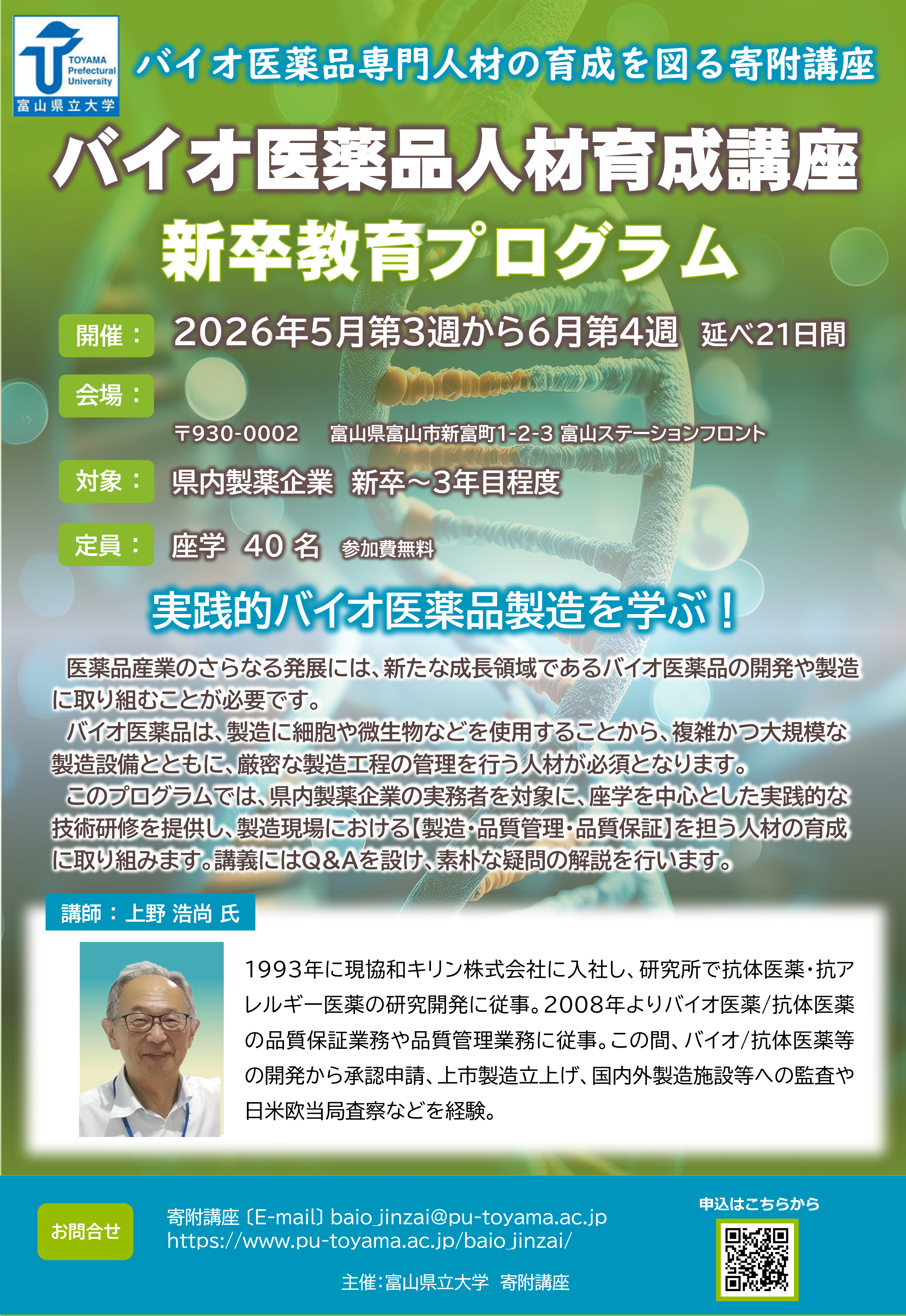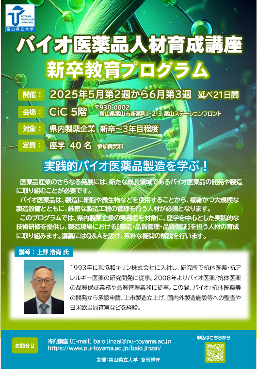 | 対 象: | 県内製薬関連企業 新卒~3年目程度 (県外企業の方は応相談) | |