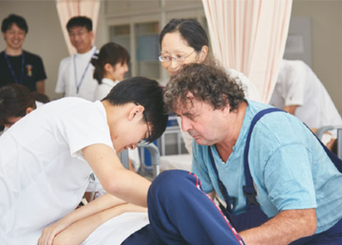 ジネスト先生が患者役の学生にお手本を実践した時、場の空気が変わりました。息づかいを感じさせる距離で見つめ、触れる際には、指先から包み込むように、そして常にその様子を実況中継するかのように一つ一つやさしく話しながらケアを行っていくその一連の流れに、学生たちは食い入るように見つめていました。それはとても自然で温かな雰囲気の中で穏やかな時が流れるようなお手本でした。その後、ジネスト先生のしたように学生たちも実践。真剣な眼差しの中で、うまくできた時などは嬉しそうな笑みがこぼれるなど、イキイキとした学生の姿がそこにはありました。